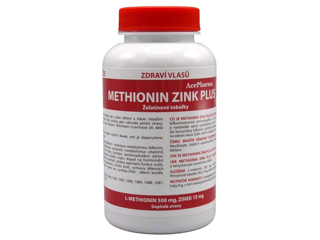 Methionin je esenciální proteinogenní bílkovinotvorná aminokyselina. Je nejméně zastoupená aminokyselina a lidské tělo si ji nedokáže samo syntetizovat, proto ji musíme do organismu dodávat. Methionin zasahuje do biosyntézy bílkovin, cysteinu, kreatinu a karnitinu. . Zinek přispívá k udržení normálního stavu vlasů, nehtů a k udržení normálního stavu pokožky. Jedna tobolka obsahuje 500mg Methioninu a Zinek 15mg v 1 tobolce.
