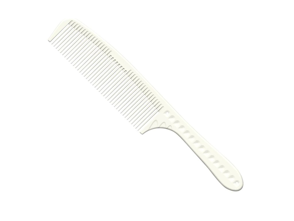Barber hřeben na střihání vlasů od značky JRL v bílé barvě o délce 7,6? (19,3 cm) vhodný pro techniku střihu clipper-over comb. Je vyroben z kvalitního, lehce ohebného, ale pevného plastu s tepelnou odolností až 240°C. Má patentovaný vroubkovaný design zubů, který pomáhá zvednout vlasy.