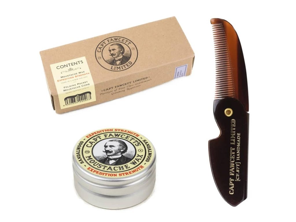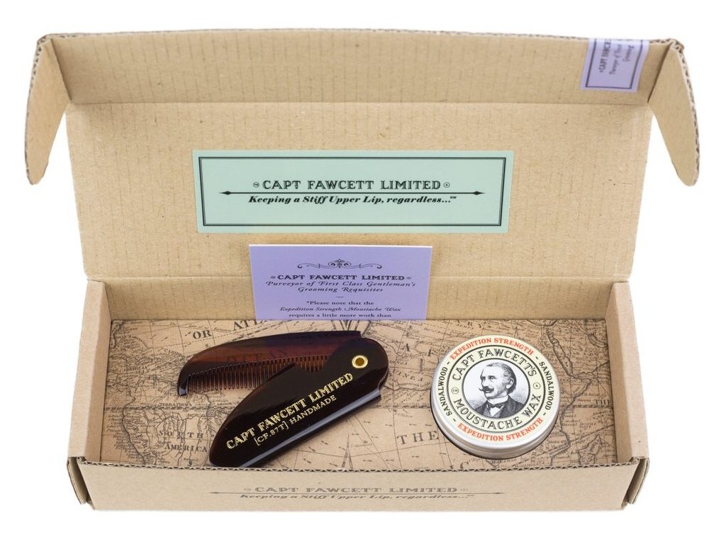 Dárková sada vosku a skládacího hřebínku na knír CAPTAIN FAWCETT Expedition Strength - legendární péče pro legendární knír.