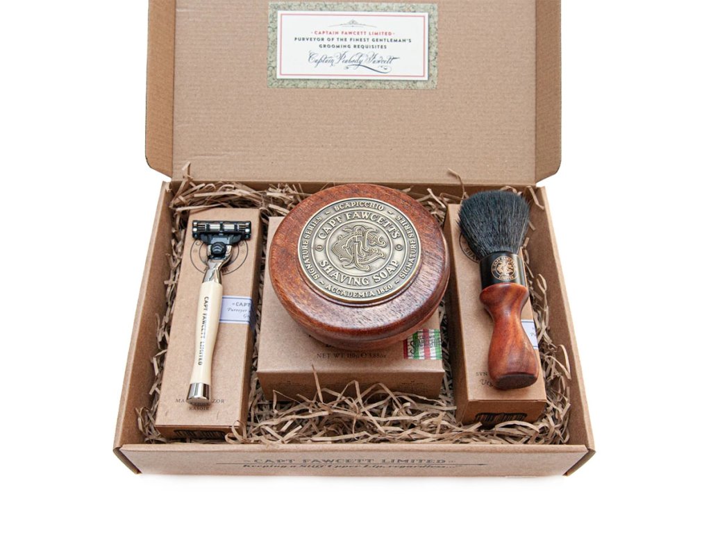 Kapitán Fawcett s potěšením představuje tuto dárkovou krabičku na holení, jež je oslavou mimořádného holičského dědictví rodiny Scapicchio a jejich celosvětového věhlasu jako specialistů na ušlechtilé umění starého italského holení pocházejícího z roku 1820. Středobodem sady je nádherně vonící mýdlo na holení inspirované hojnými fíkovými a olivovými háji, které se nacházejí v rodné Apulii rodiny Scapicchio, postříkané nádechem rumu ze západoindické zátoky. Dále v sadě nalezneme štětku na holení se syntetickými štětinami a praktickou dřevěnou rukojetí. Syntetické štětiny si kvalitou v ničem nezadají s těmi jezevčími. Krom toho, že kvůli nim nemusel zahynout žádný vzteklý jezevec. Třešničkou na dortu je oblíbený holicí strojek kapitána Fawcetta a jeden z mnoha vynálezů doby krále Eduarda VII. Dodáván je s vyměnitelnou moderní hlavicí Mach 3.