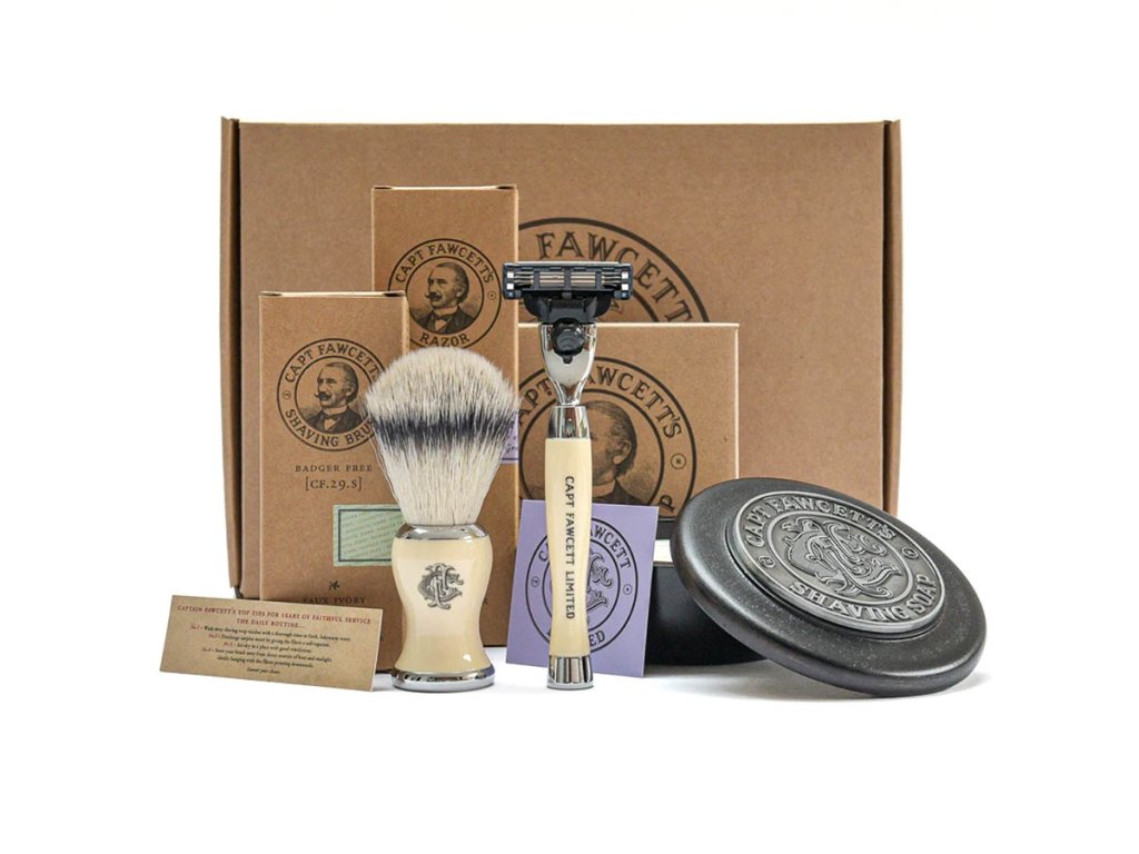 Luxusní dárková sada pro klasické mokré holení od tradiční anglické značky CAPTAIN FAWCETT. Obsahuje mýdlo na holení v dřevěné misce, elegantní štětku a strojek na holení kompatibilní s Mach 3. Styl pro gentlemany.