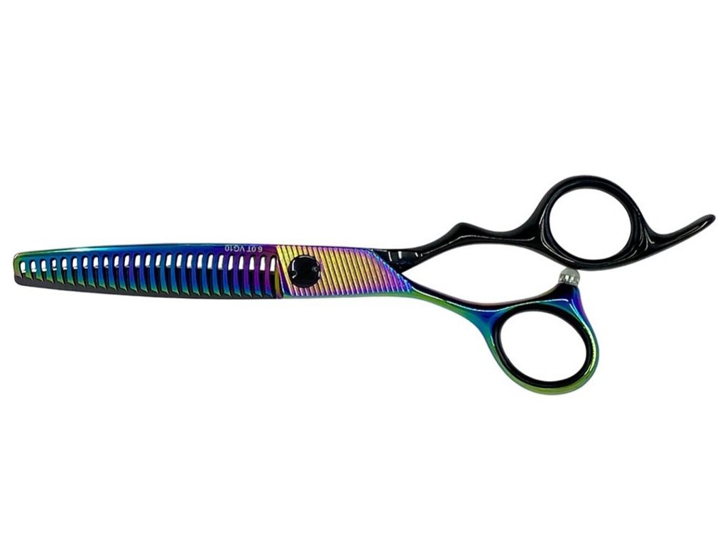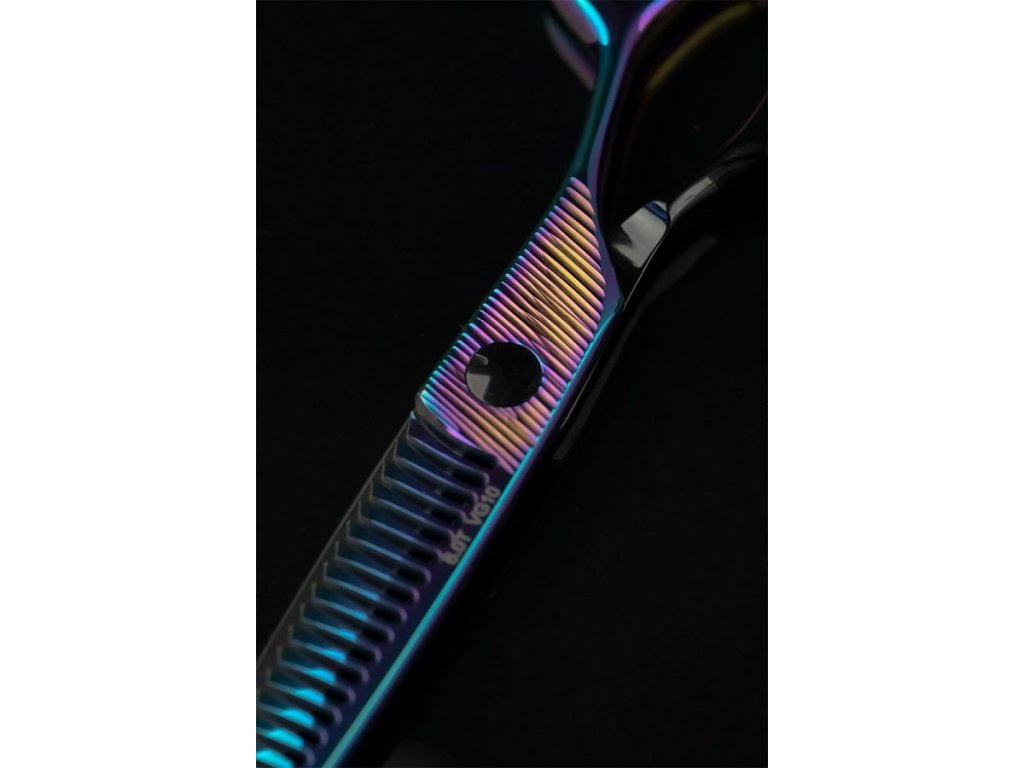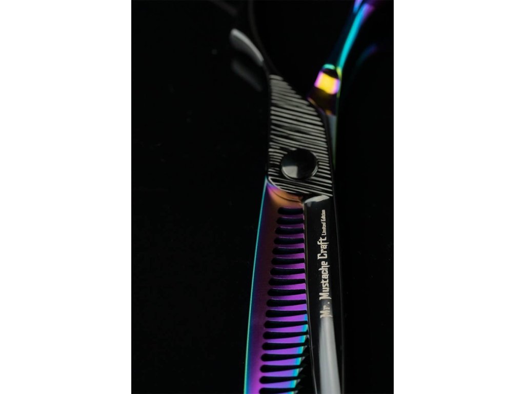Profesionální prostřihávací nůžky Mr. Mustache Craft Gasolina z VG10 japonské oceli nabízejí precizní střih, mimořádnou ostrost a luxusní duhový design. Díky titanovému povlaku jsou extrémně odolné. Ergonomické s 30 zuby poskytujícími perfektní efilační výkon. 5letá záruka kvality.