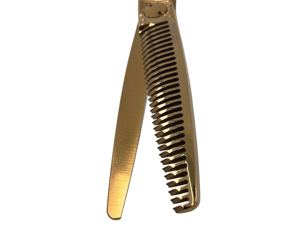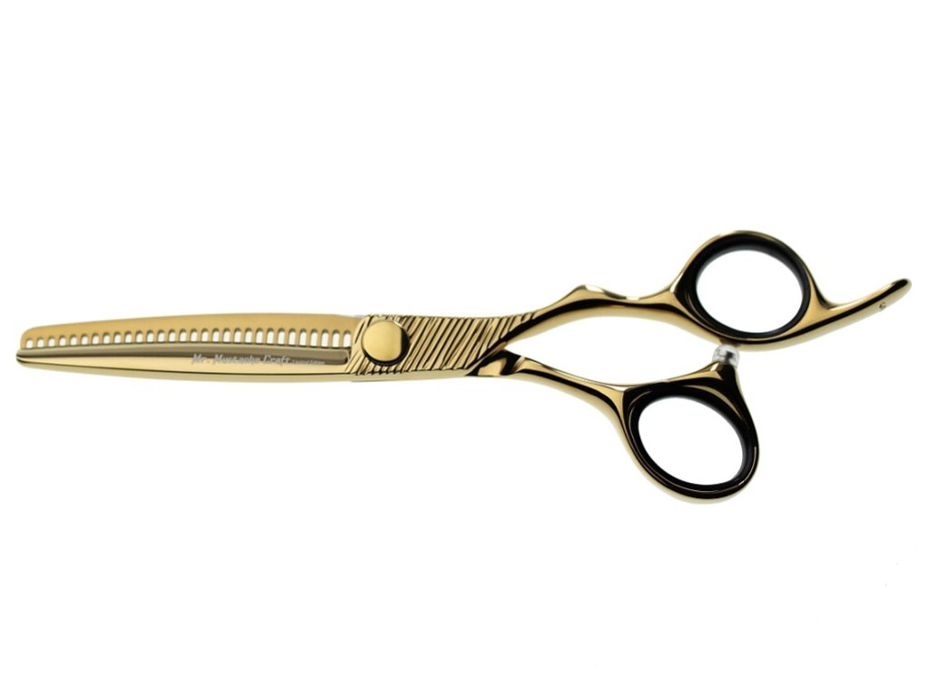 Profesionální prostřihávací nůžky Mr. Mustache Craft Gold z VG10 japonské oceli nabízejí precizní střih, mimořádnou ostrost a luxusní zlatý design. Díky titanovému povlaku jsou extrémně odolné. Ergonomické s 30 zuby poskytujícími perfektní efilační výkon. 5letá záruka kvality.