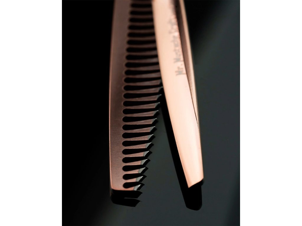 Profesionální prostřihávací nůžky Mr. Mustache Craft Rose Gold z VG10 japonské oceli nabízejí precizní střih, mimořádnou ostrost a luxusní růžově zlatý design. Díky titanovému povlaku jsou extrémně odolné. Ergonomické s 30 zuby poskytujícími perfektní efilační výkon. 5letá záruka kvality.