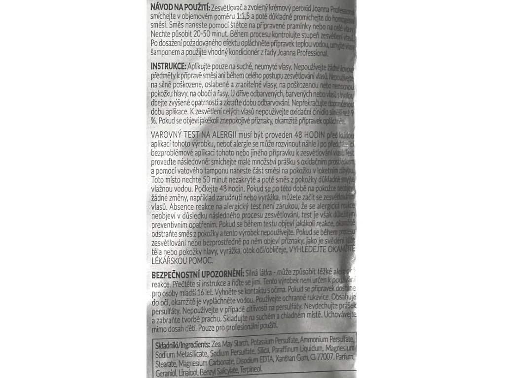 INSTRUKCE: Aplikujte pouze na suché, neumyté vlasy. Nepoužívejte žádné kovové předměty k přípravě směsi ani během celého postupu zesvětlování vlasů. Nepoužívejte na silně poškozené, oslabené a zranitelné vlasy, na poškozenou nebo nemocnou pokožku hlavy, na obočí a řasy. U dříve odbarvených, barvených nebo vlasů s trvalou dbejte zvýšené opalrnosti a zkraťte dobu odbarvování. Nepřekračujte doporučenou dobu aplikace. K zesvětlení celých vlasů nepoužívejte oxidační činidlo silnější než 9 %. Pokud se objeví jakékoli znepokojivé příznaky, okamžitě přípravek opláchněte.