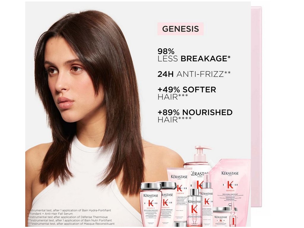 KÉRASTASE Genesis Bain Hydra-Fortifiant Shampoo 80ml - posilující šampon proti padání pro jemné a mastné vlasy. Obsahuje vysoce účinné přírodní složky, které snižují viditelné vypadávání vlasů a to až o 80,9 %. Šampon posiluje kořínky vlasů a vlasy chrání před mechanickým poškozováním. Jemná gelová konzistence šamponu se při kontaktu s vodou přemění na bohatou hustou pěnu. Ta účinně a přitom šetrně z vlasů a vlasové pokožky odstraňuje přebytečný maz a nečistoty. Vlasy budou již po první aplikaci šamponu lehoučké jako peříčko, sametově hebké, zářivě lesklé a především chráněné před nežádoucím vypadáváním vlasů.