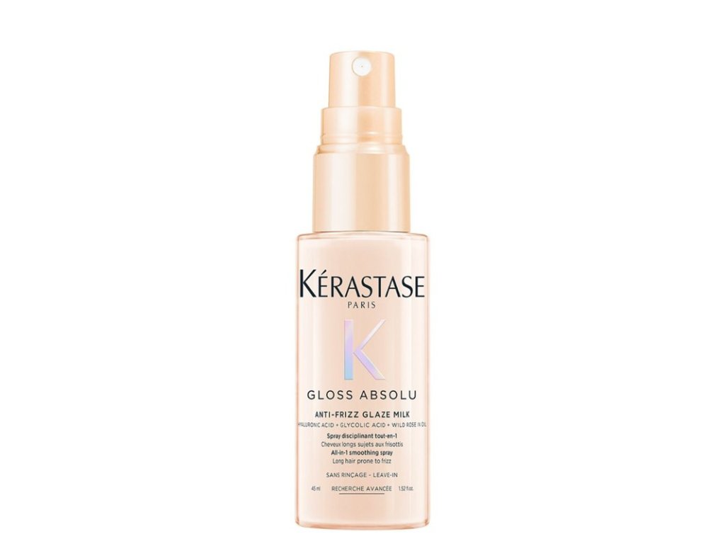 Multifunkční uhlazující sprej Kérastase Gloss Absolu Anti-Frizz Glaze Milk je určený pro vlasy náchylné ke krepatění. Obsahuje kyselinu hyaluronovou, kyselinu glykolovou a olej z divoké růže, aby poskytoval snové, pružné a lesklé vlasy a to až po 4 dny. Rychle se vstřebává, má lehkou mléčnou texturu, chrání vlasy při tepelném stylingu a usnadňuje foukání.