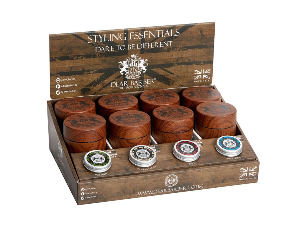 Profesionální prezentační box s oblíbenými stylingy DEAR BARBER. Kompletní sada pro barber shopy, atraktivní forma prodeje, výhodná cena.