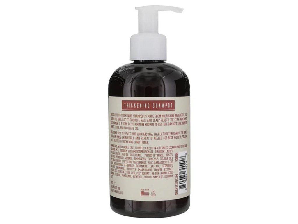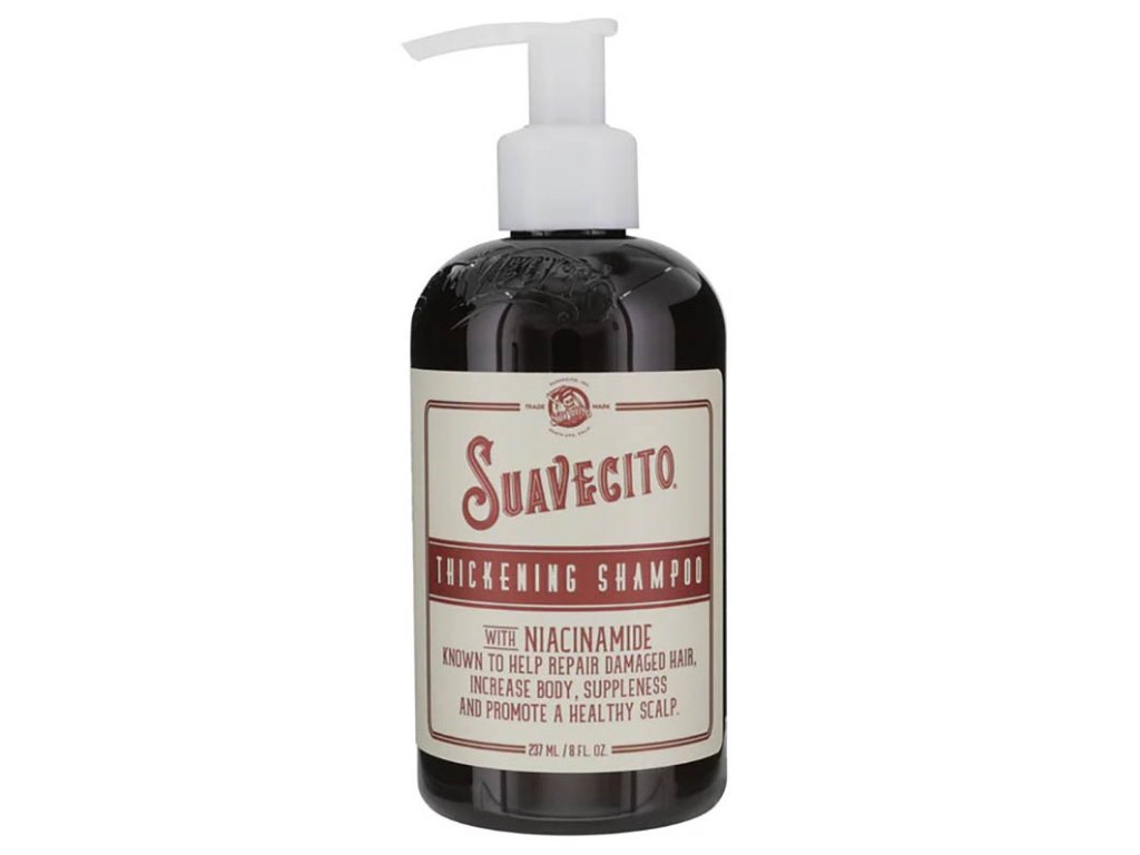 Zhušťující šampon SUAVECITO s niacinamidem, panthenolem a aloe pro hustší, pevnější a zdravě vypadající vlasy. Posiluje růst vlasů a zlepšuje jejich vzhled.