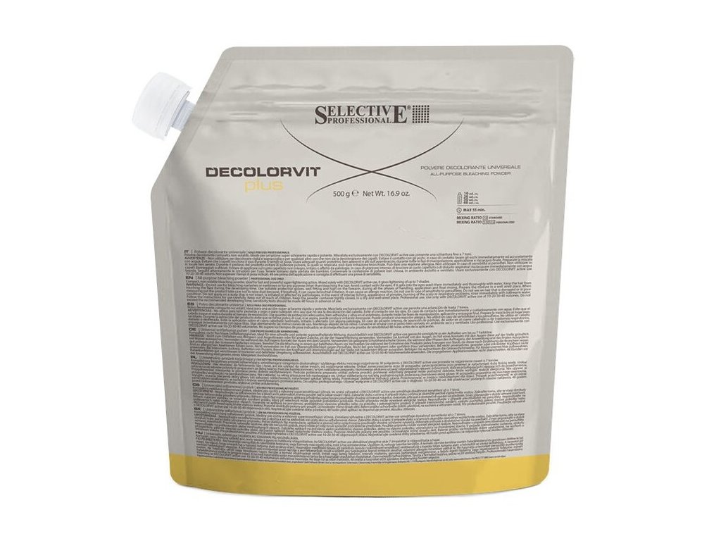 SELECTIVE Professional - DECOLORVIT PLUS BLEACHING POWDER 500g * kompaktní odbarvovací prášek s mimořádně rychlým a silným zesvětlovacím účinkem - až o 7 tónů * rovnoměrné a pravidelné zesvětlení jak na přirozených tak i na bavených vlasech * míchaní s peroxidem v poměru 1:1 až 1:2 v závislosti na požadované intenzitě zesvětlení * krémový peroxid ( Selective Acqua Osigenata nebo Decolorvit Active Use) není součástí balení a je nutno jej dokoupit zvlášť * síla peroxidu se řídí odstínem barvy a druhem vlasů ( 6% 20vol, 9% 30vol a 12% 40vol ), odbarvovací postup a způsob míchání je uveden v příbalovém letáku * vyrobeno v Itálii * PRO PROFESIONÁLNÍ POUŽITÍ *