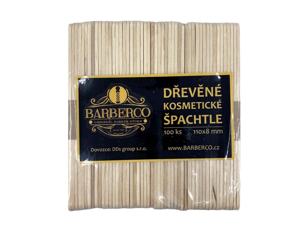 Dřevěné špachtle k nanášení vosku BARBERCO 110x8 mm - 100 ks: Dřevěné kosmetické špachtle BARBERCO ve větší velikosti k nanášení vosku na větší části těla.
