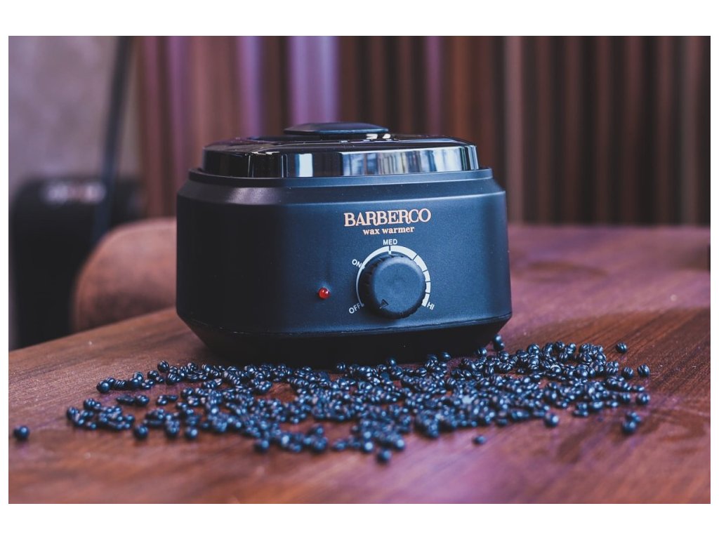 Depilační balíček BARBERCO, který obsahuje vše, co potřebujete pro depilaci. Součástí startovací depilační sady je ohřívač depilačního vosku, balení voskových zrnek a dřevěné špachtle k nanášení vosku.