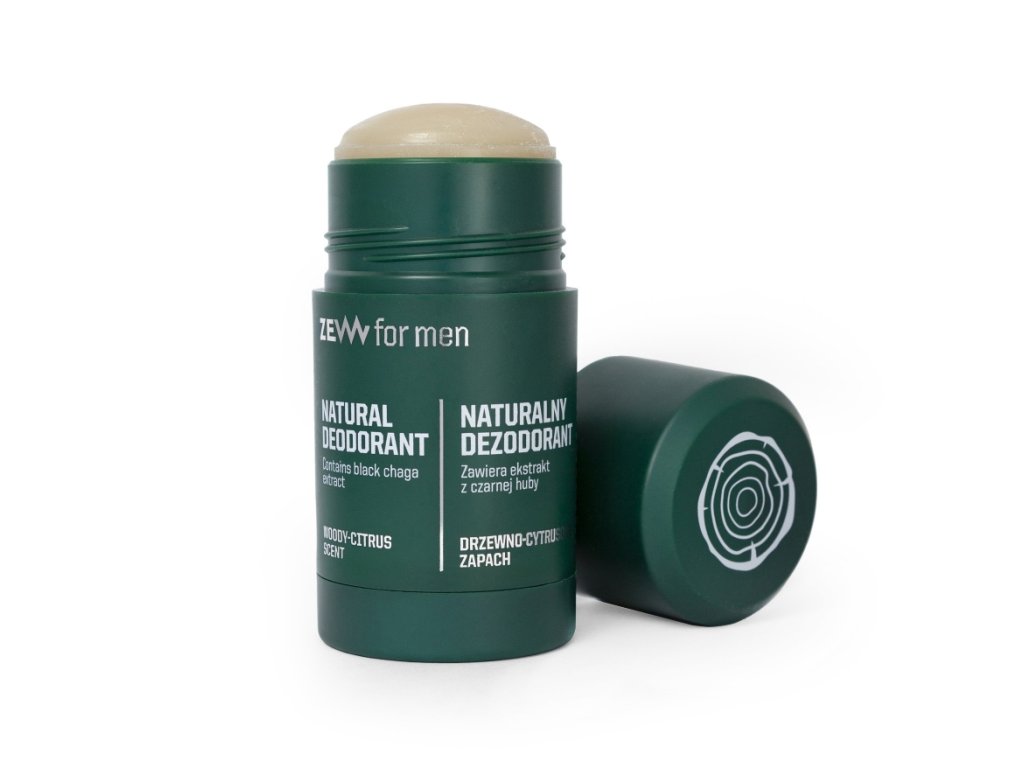 Přírodní tuhý deodorant ZEW FOR MEN s výtažkem z černé chaga houby vás spolehlivě ochrání před potem a nepříjemným pachem po celý den. Poskytuje mužnou, dřevitě-citrusovou vůni.
