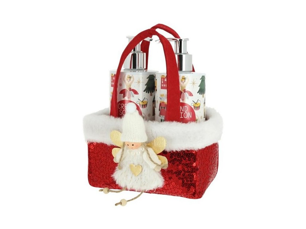 Netradiční, originální dárkový vánoční set v červené flitrové taštičce ozdobené kožíškem a vílou. Obsahuje tekuté mýdlo a mléko na ruce. Krásné provedení výrobků podtrhuje okouzlující vůně kombinující podmanivou Pivoňku a Pačuli.